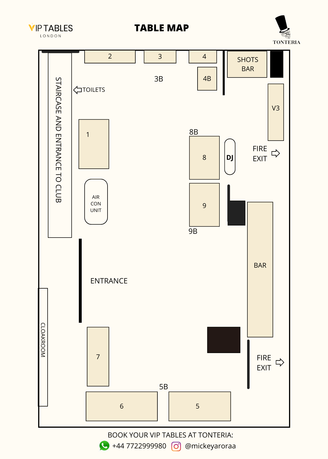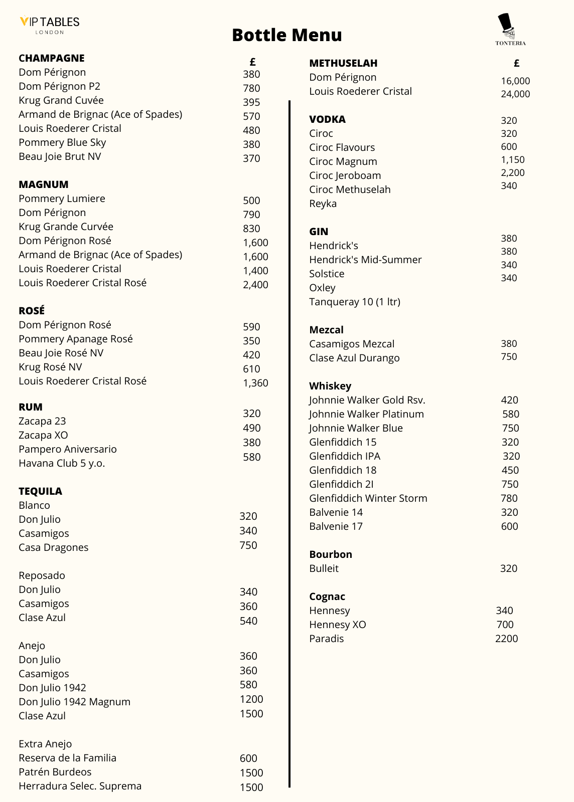 The starting cost at Tonteria for a table is £1000 min spend, and the VIP Tonteria table prices begin from £2000 min spend for groups of up to 10.